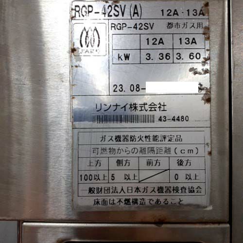 他の画像を見る 直接引取の場合は送料追加なし【新潟店】 【中古】上火式焼物器 リンナイ(Rinnai) RGP-42SV 幅500×奥行310×高さ395 都市ガス 【送料別途見積】【業務用】【新潟店在庫】 販売価格 ¥ 42,900 税込