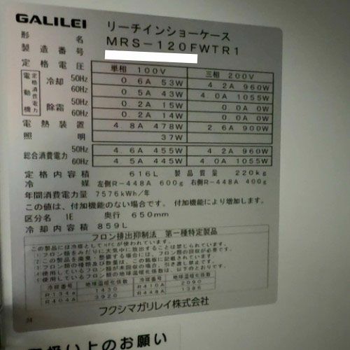 他の画像を見る 直接引取の場合は送料追加なし【福岡店】 【中古】冷凍リーチインショーケース フクシマガリレイ(福島工業) MRS-120FWTR1 幅1200×奥行650×高さ1900 単相100V/三相200V 【送料別途見積】【業務用】【福岡店在庫】 販売価格 ¥ 572,000 税込