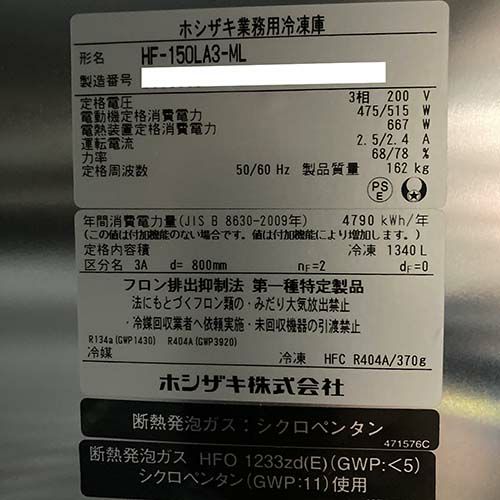 他の画像を見る 直接引取の場合は送料追加なし【春日井店】 【業界最長1年保証】【中古】縦型冷凍庫 ホシザキ HF-150LA3-ML 幅1500×奥行800×高さ1910 三相200V 【送料別途見積】【業務用】【春日井店在庫】 販売価格 ¥ 299,200 税込 詳細を見る