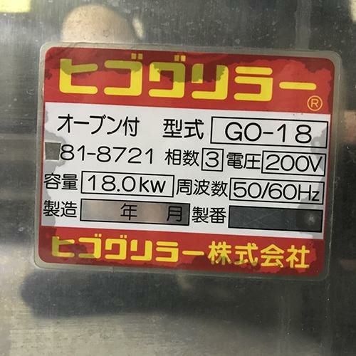 他の画像を見る 直接引取の場合は送料追加なし【岐阜店】 【業界最長1年保証】【中古】電気式焼物器 ヒゴグリラー GO-18 幅1020×奥行650×高さ1040 三相200V 【送料別途見積】【業務用】【岐阜店在庫】 販売価格 ¥ 140,250 税込