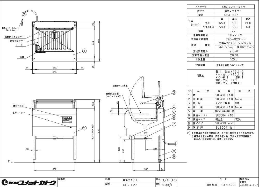 他の画像を見る コストパフォーマンスに優れた、スタンダードフライヤー。 【業務用/新品】【コメットカトウ】電気フライヤー 27L CF3-E27 1槽式 幅650×奥行600×高さ800(mm)【送料無料】 定価 ¥ 907,500 (税込)のところ 販売価格 ¥ 517,265 税込