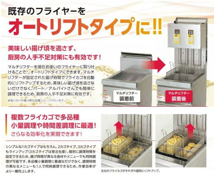 他の画像を見る 既存のフライヤーをオートリフトタイプに! MLF-G13-2 【マルゼン】 マルチリフター 13リットルタイプ(2カゴ) 間口335×奥行284×高さ715(mm) 【業務用/新品】【送料無料】 定価 ¥ 349,800 (税込)のところ 販売価格 ¥ 205,124 税込 詳細を見る