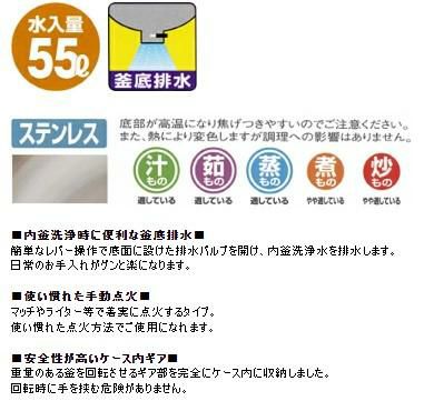 他の画像を見る 【業務用/新品】【マルゼン】ガス回転釜 55L 鋳鉄製 自動点火式 MKGD-T055 幅1255×奥行862×高さ780mm【送料別途見積】 定価 ¥ 554,400 (税込)のところ 販売価格 ¥ 325,146 税込 詳細を見る