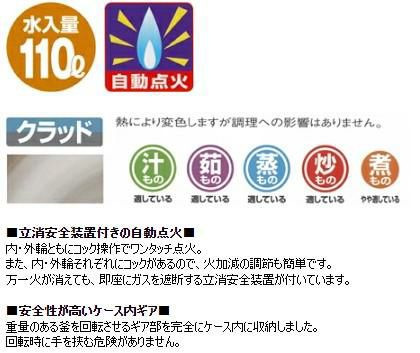 他の画像を見る 【業務用/新品】【マルゼン】ガス回転釜 110L 鋳鉄製 自動点火式 MKGD-T110 幅1360×奥行967×高さ810mm【送料別途見積】 定価 ¥ 589,600 (税込)のところ 販売価格 ¥ 345,791 税込 詳細を見る