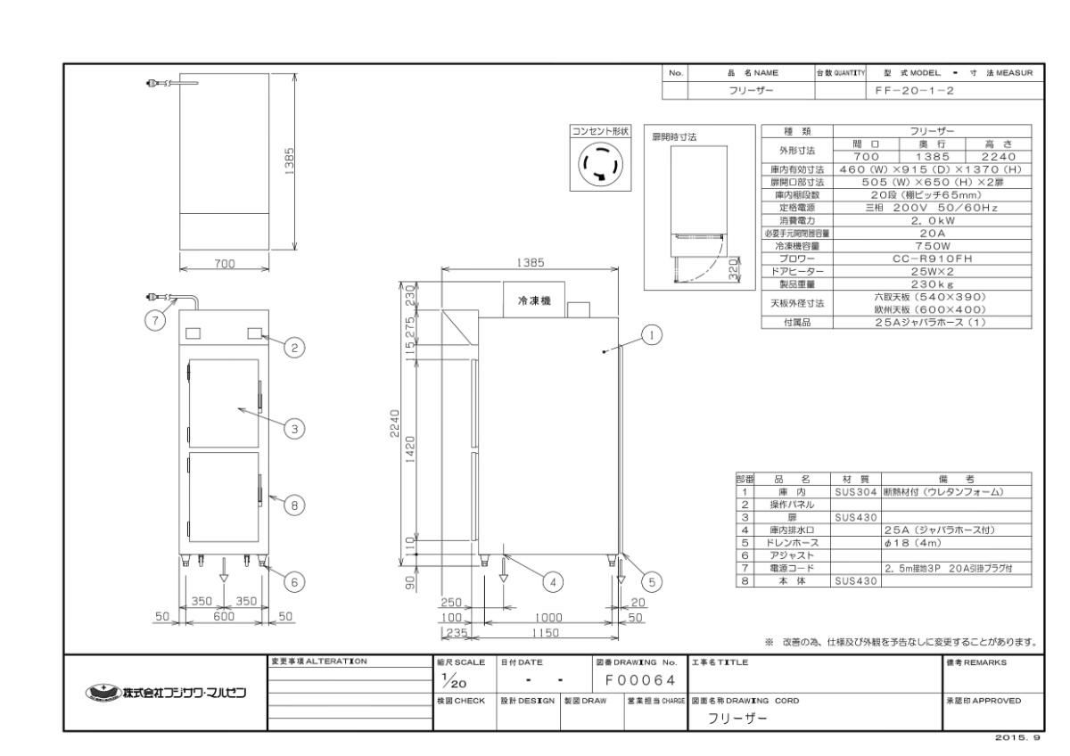他の画像を見る 【業務用/新品】【マルゼン】フリーザー FF-20-1-2 幅700×奥行1385×高さ2250(mm) 三相200V【送料無料】 定価 ¥ 2,310,000 (税込)のところ 販売価格 ¥ 1,908,737 税込 詳細を見る