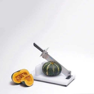 硬いかぼちゃの半割・四つ割カットがてこ式で楽々。1 刃渡り36cmの3mm厚ステンレス鋼を使用しています。