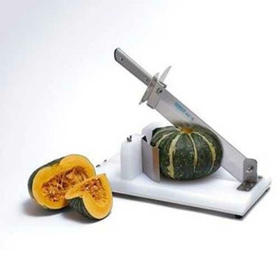 硬いかぼちゃもてこ式でスムーズにカットできます。1 刃渡り36cmの3mm厚ステンレス鋼包丁を使用。