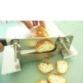 カットガイドで厚み一定(3~60mm)。カット後は台から落ちるため連続作業ができます。1 刃渡り19cmのステンレス包丁で切れ味がいい。