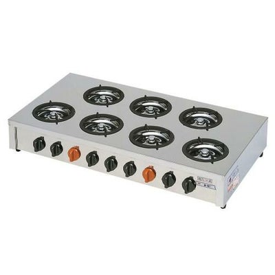 ●3口から7口までもある多目的コンロ、一人前ずつの調理には特に重宝。お客さまのニーズが多様化され、飲食店もメニューの多品種・少量化が求められています。そこで活躍するのが、目的に合わせて選べる豊富な機種とクイックサービスで対応できる強火力なコンパクトタイプの飯城です。飯城