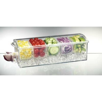 ●底部に氷を敷いてコンジメントを保冷します。※アメリカ製プロダイン ICED(アイスド)シリーズ外側の容器に氷を入れ、内側のステンレス容器を 冷却して食材を保冷します。ステンレス製の容器は 樹脂などに比べて冷たさを蓄えるので、さらに冷たく、 長い時間保冷します。※ステンレス容器以外は食器洗浄機には使用できません。