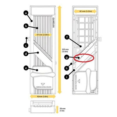 長い食材を保護ホルダーで押さえてスライスするときは、刃を通過したあたりで、保護ホルダーの押さえる位置を変えてあげると作業しやすいです。(サンドウィッチに使うキュウリを一本丸々スライスするときなど)