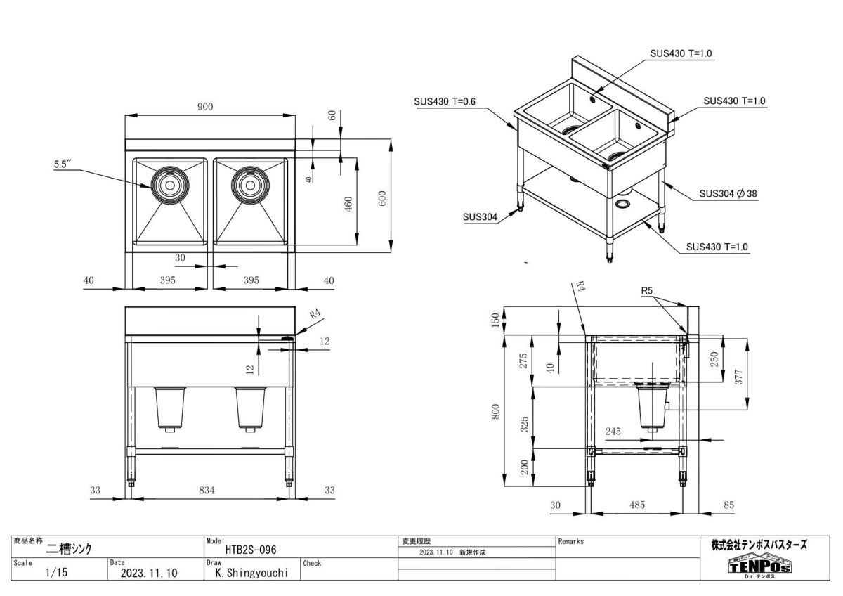 他の画像を見る 【業務用/新品】【テンポスオリジナル】2槽シンク HTB2S-096 幅900×奥行600×高さ800 バックガード高さ150(mm)【送料無料】 定価 ¥ 100,320 (税込)のところ 販売価格 ¥ 47,913 税込