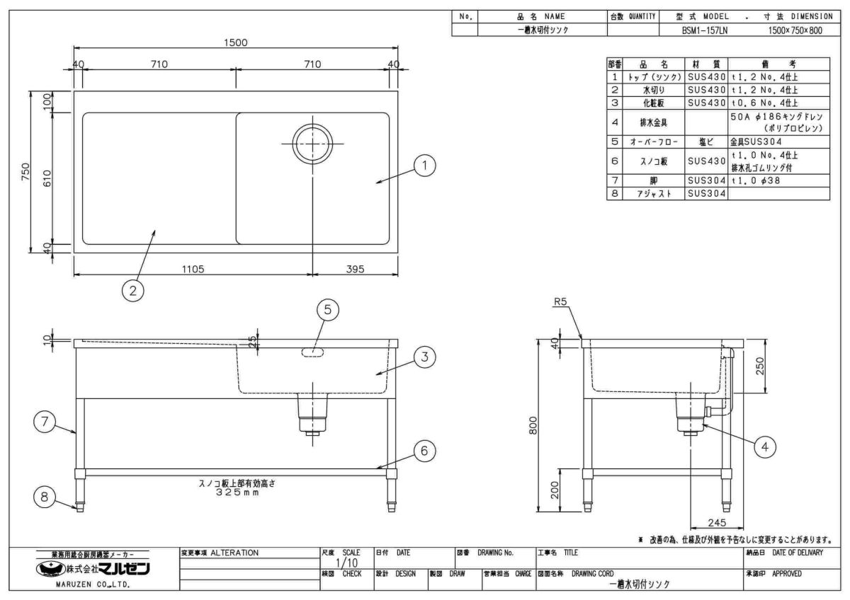 他の画像を見る BSM1-157LH/BSM1-157LNH 【マルゼン】一槽水切付シンク 左水切り 幅1500×奥行750×高さ850(mm) 【業務用/新品】【送料無料】 定価 ¥ 141,900 (税込)のところ 販売価格 ¥ 74,460 税込 詳細を見る