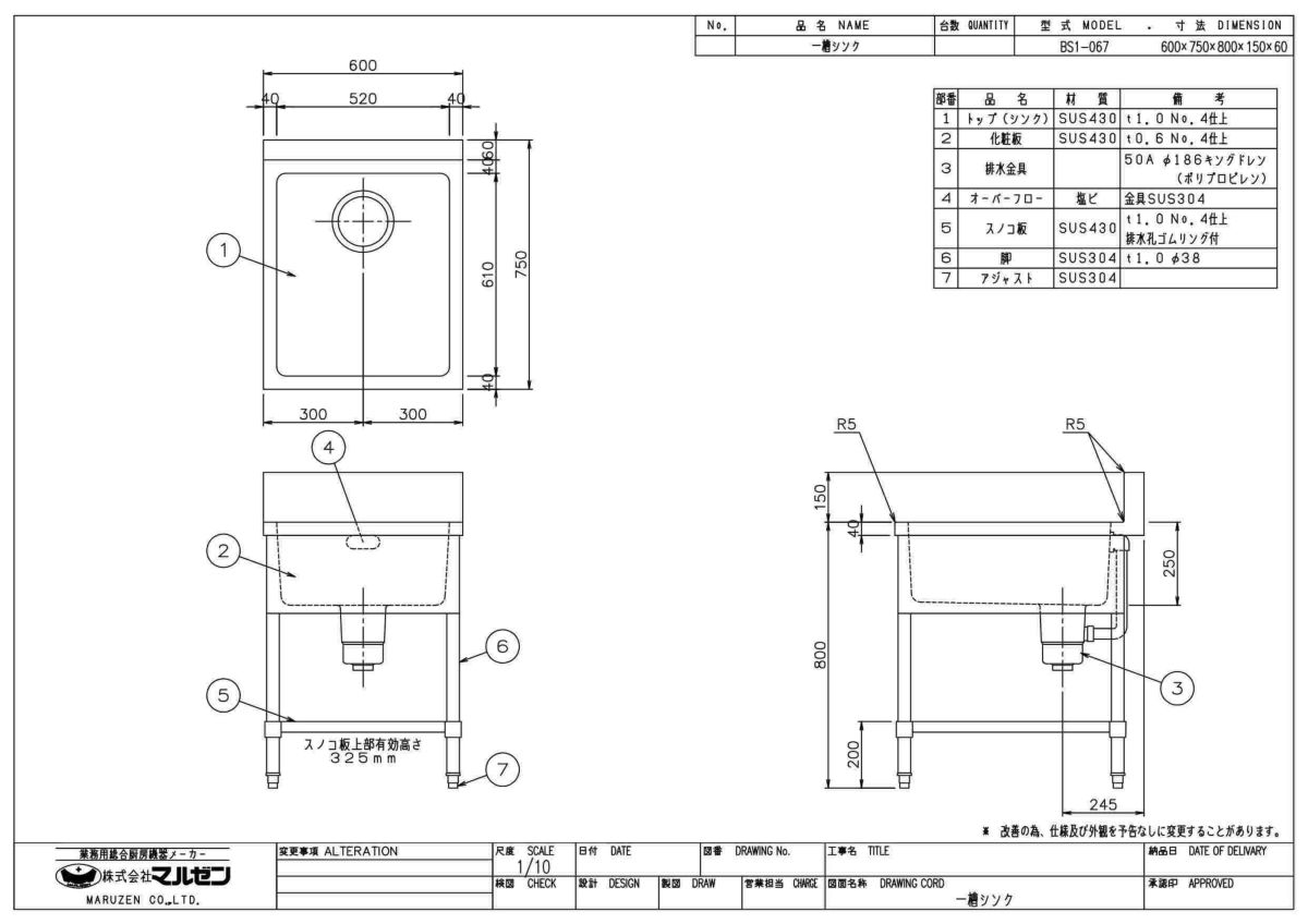 他の画像を見る BS1-067H/BS1-067NH 【マルゼン】一槽シンク 幅600×奥行750×高さ850(mm) 【業務用/新品】【送料無料】 定価 ¥ 99,000 (税込)のところ 販売価格 ¥ 51,007 税込 詳細を見る