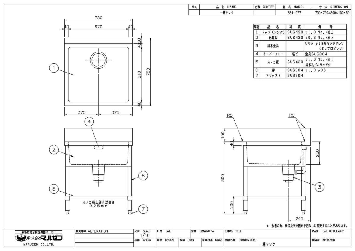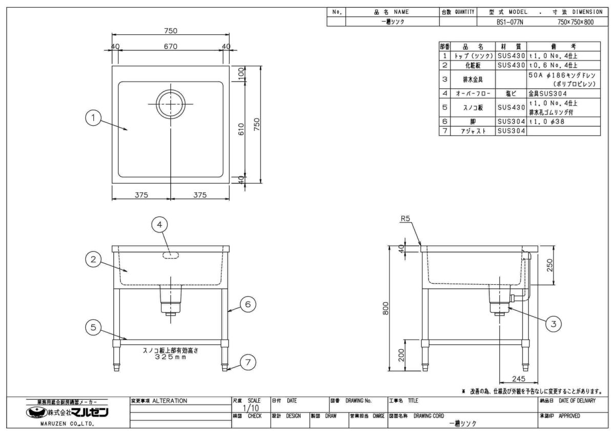 他の画像を見る BS1-077/ BS1-077N 【マルゼン】 一槽シンク 幅750×奥行750×高さ800(mm) 【業務用/新品】【送料無料】 定価 ¥ 106,700 (税込)のところ 販売価格 ¥ 47,174 税込 詳細を見る