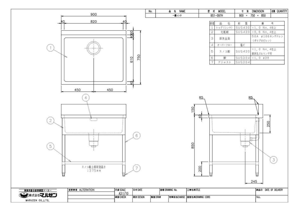 他の画像を見る BS1-097H/BS1-097NH【マルゼン】一槽シンク 幅900×奥行750×高さ850mm 【業務用/新品】【送料無料】 定価 ¥ 114,400 (税込)のところ 販売価格 ¥ 52,227 税込 詳細を見る