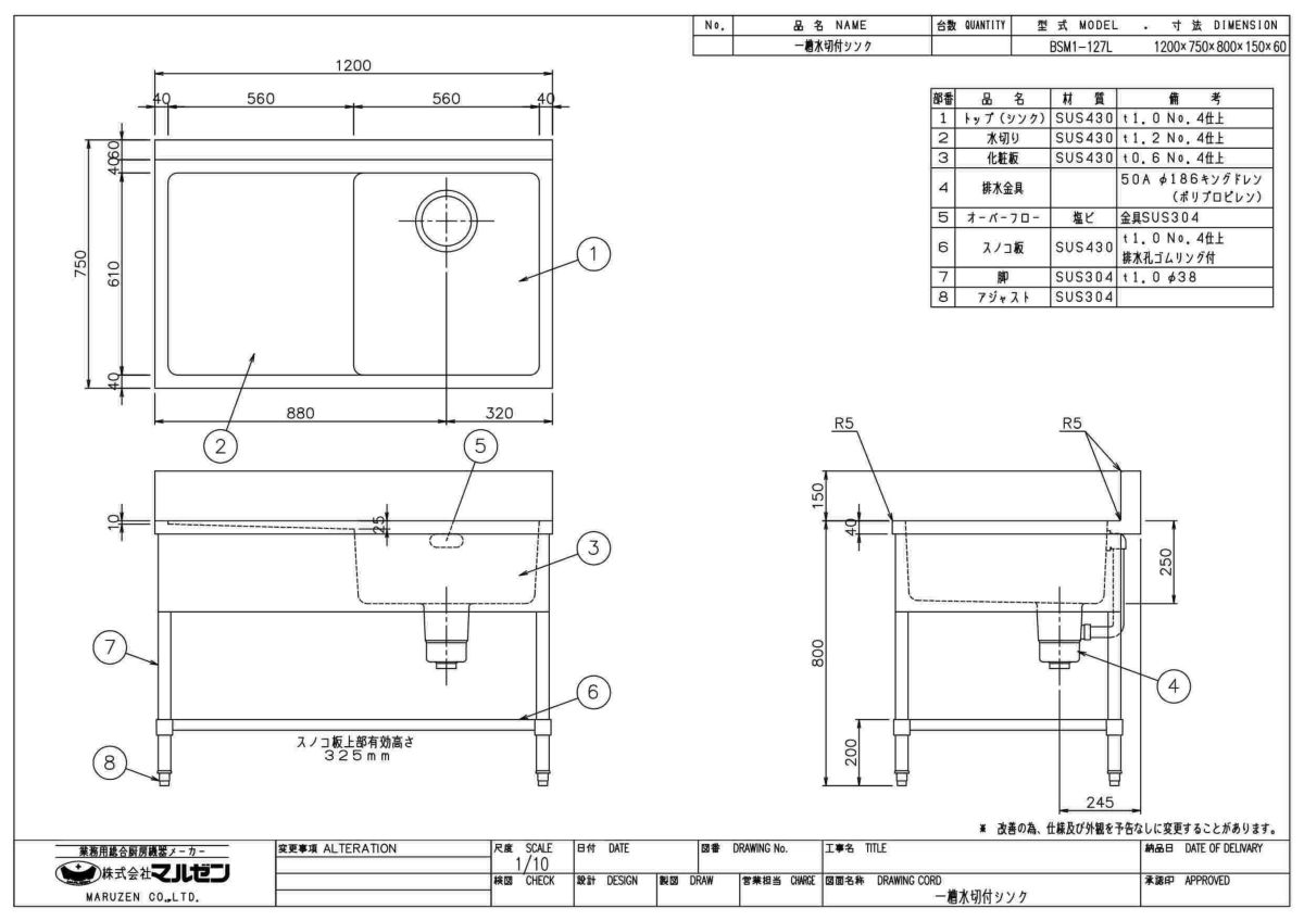 他の画像を見る 【2月末までのお届け分限定価格】BSM1-127R,BSM1-127RN 【マルゼン】 一槽水切付シンク 右水切り 幅1200×奥行750×高さ800(mm) 【業務用/新品】【送料無料】 定価 ¥ 130,900 (税込)のところ 販売価格 ¥ 57,397 税込 詳細を見る
