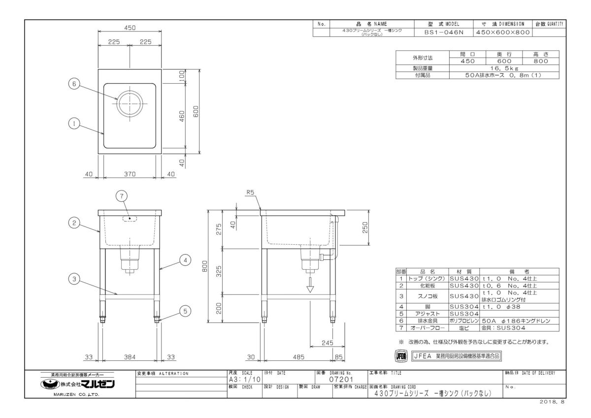 他の画像を見る BS1-044,BS1-044N 【マルゼン】 一槽シンク 幅450×奥行450×高さ800(mm) 【業務用/新品/送料無料】 定価 ¥ 69,300 (税込)のところ 販売価格 ¥ 31,637 税込 詳細を見る