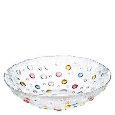 ●バブルコンフェティ・シリーズは、透明ガラスにレッド・イエロー・ブルーの宝石のようなドットが散りばめられています。このカラフルなドットは、丁寧にハンドペイントによって色付けされています。ドットには立体感があり、キュートな雰囲気と使いやすさで人気です。食卓はもちろんのこと、食器棚にしまっているときもインテリアのように輝きます。