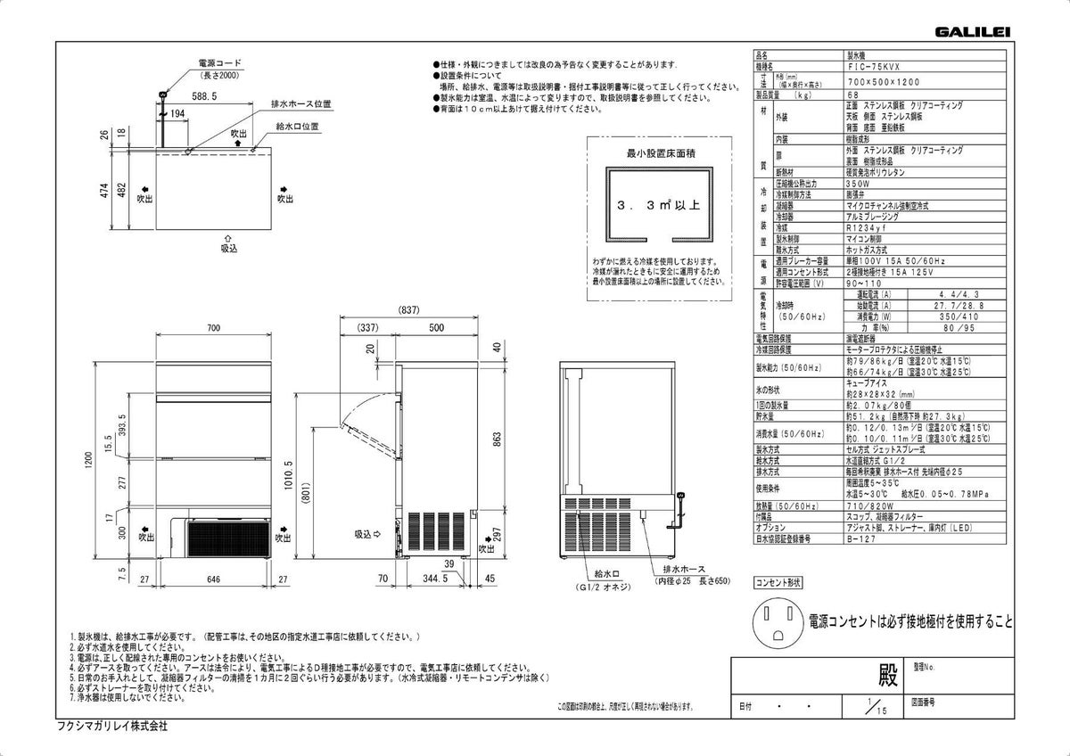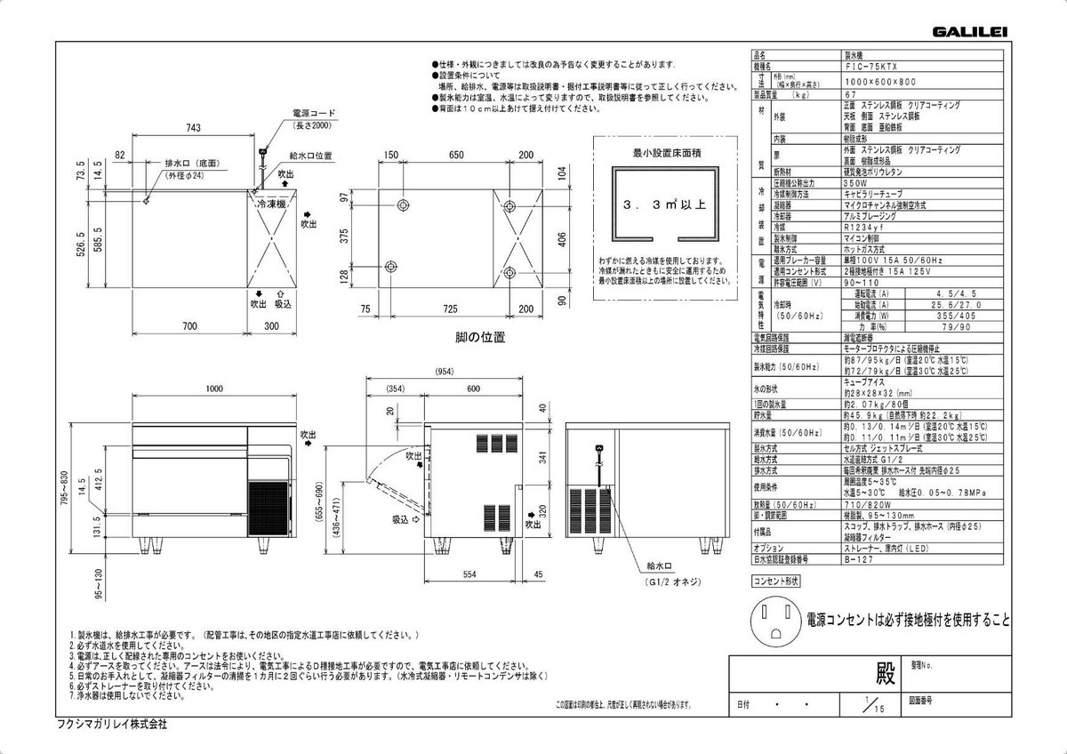 他の画像を見る 【3月限定!搬入設置10%OFF】FIC-95KTX【フクシマガリレイ】ノンフロン製氷機95kg 幅1000×奥行600×高さ800(mm) 単相100V 【業務用/新品】【送料無料】 定価 ¥ 1,285,900 (税込)のところ 販売価格 ¥ 365,991 税込 詳細を見る