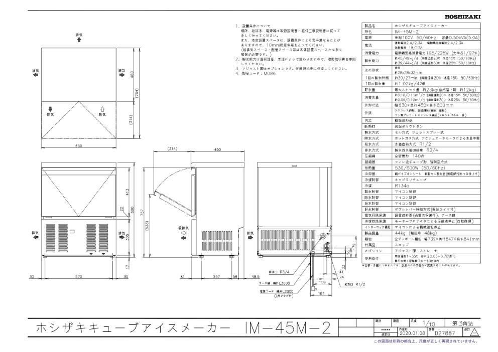 他の画像を見る 【3月限定!搬入設置10%OFF】IM-45M-2【ホシザキ】製氷機45kg 幅630×奥行450×高さ800mm 単相100V 【業務用/新品】【送料無料】 定価 ¥ 921,800 (税込)のところ 販売価格 ¥ 339,611 税込 詳細を見る