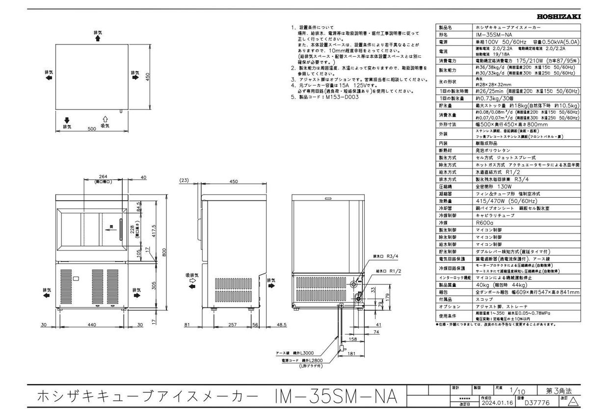 他の画像を見る 【3月限定!搬入設置10%OFF】IM-35P【ホシザキ】アンダーカウンタータイプ 製氷能力35kg 幅500×奥行450×高さ800mm 単相100V 【業務用/新品】【送料無料】 定価 ¥ 720,500 (税込)のところ 販売価格 ¥ 265,448 税込 詳細を見る