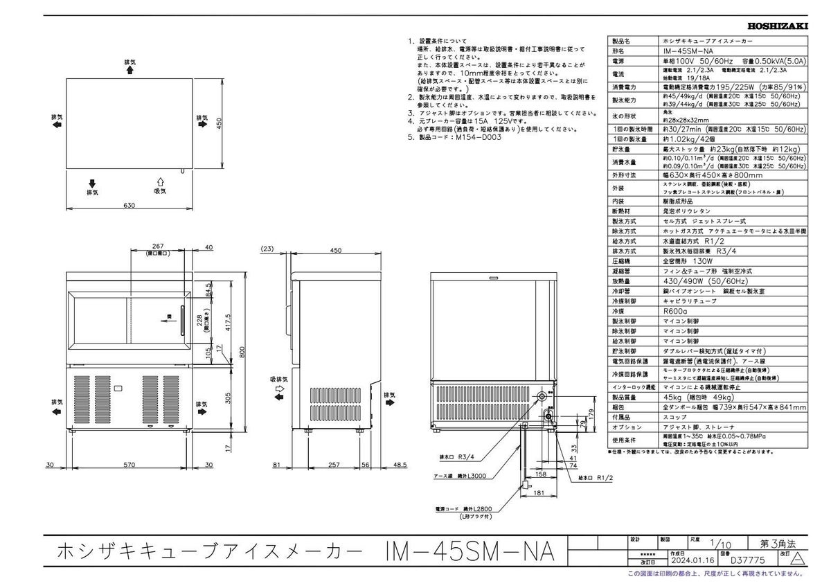 他の画像を見る IM-45SP【ホシザキ】自然冷媒製氷機キューブアイスメーカー空冷式 スライド扉タイプ 製氷能力45kg【受注生産品】 幅630×奥行450×高さ800mm 単相100V 【業務用/新品】【送料無料】 定価 ¥ 965,800 (税込)のところ 販売価格 ¥ 364,212 税込 詳細を見る