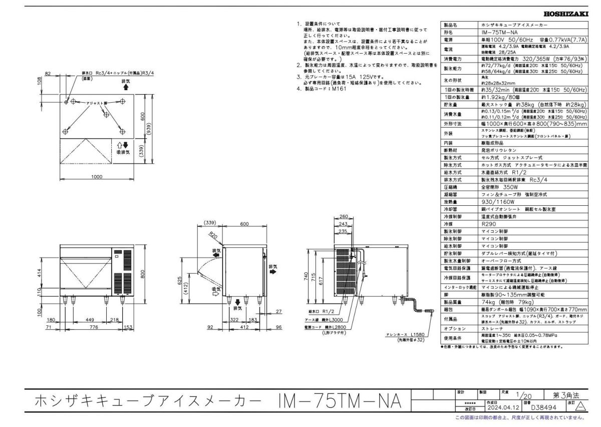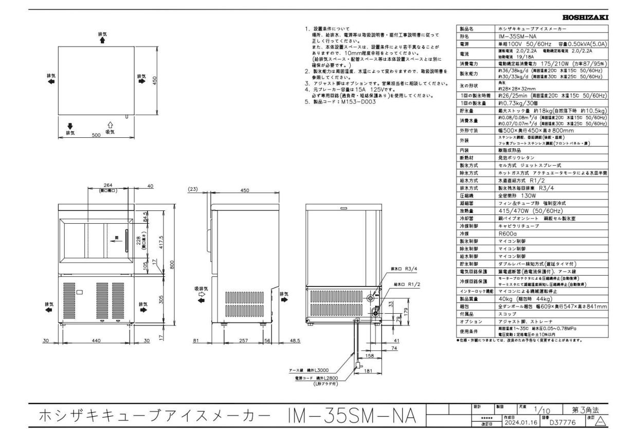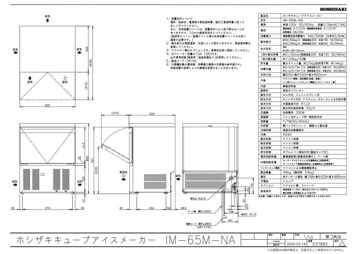 他の画像を見る 【限定価格】IM-45M-2【ホシザキ】製氷機45kg 幅630×奥行450×高さ800mm 単相100V /業務用新品/送料無料※設置必須 (別途見積) 定価 ¥ 921,800 (税込)のところ 販売価格 ¥ 320,064 税込 詳細を見る