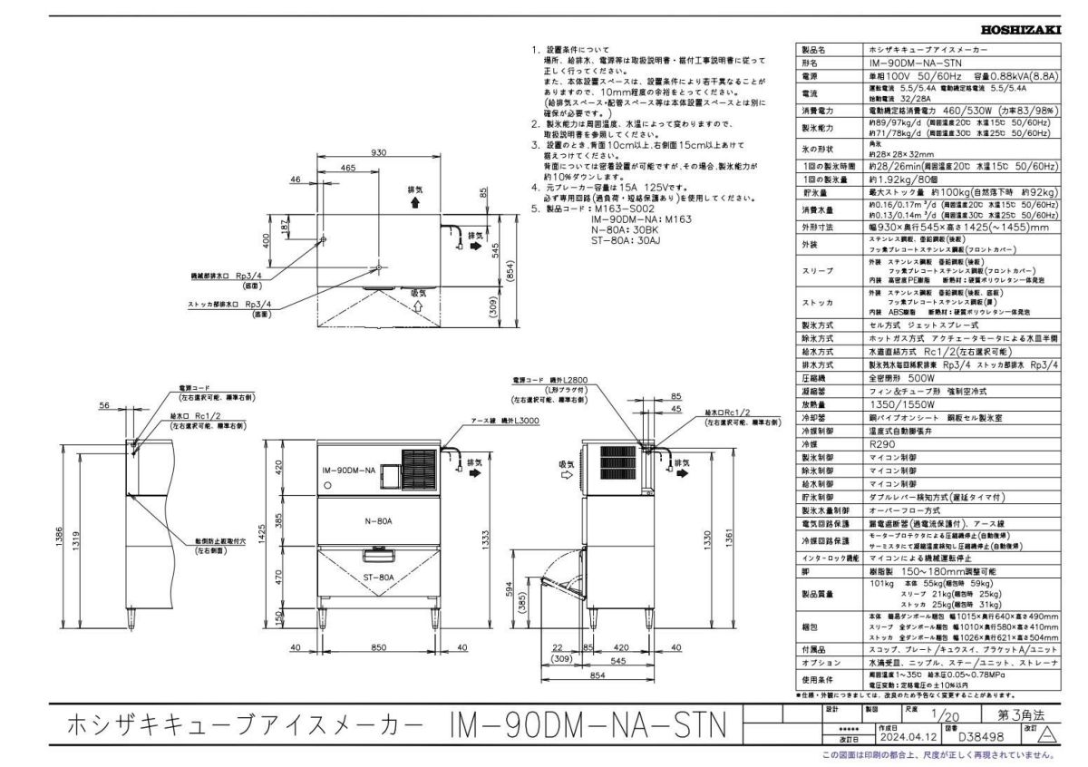 他の画像を見る IM-90DM-1-STN【ホシザキ】キューブアイスメーカー(スタックオン) 幅930×奥行545×高さ1425(mm) 単相100V 【業務用/新品】【送料無料】 定価 ¥ 1,613,700 (税込)のところ 販売価格 ¥ 594,521 税込 詳細を見る