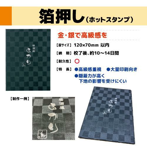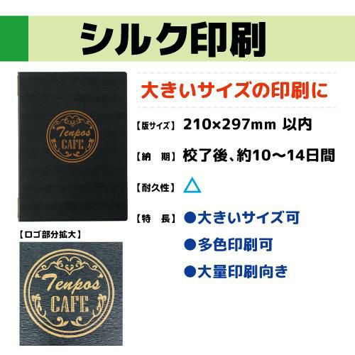 デザイン・素材 サイズ こんなお悩みありませんか? メニューブックの選び方がわからない メニューブックがすぐに汚れてしまう お店の雰囲気に合うデザインが見つけられない どのサイズにしたらいいのか分からない 初めてでも安心! メニューブック選びのポイント \ プロが教える、お店に最適な一冊の選び方 / 店舗別おすすめ お店の雰囲気に合わせて 居酒屋・和食 8ページ構成で豊富なメニューを掲載高級感の演出も可能 和風デザインが人気 カフェ・スイーツ 小さめサイズ+木製バインダーが定番ランチメニューなどに最適 洋風デザインが人気 鉄板焼き・焼肉など 熱に強い耐熱タイプが人気 耐熱タイプ ページ数の目安 見やすい、選びやすいメニュー表に ランチメニューなど ブックに入れずラミネート加工で作成も可能 メイン 単品メニュー中心 4ページOK 表紙 メイン ドリンク 裏表紙 ドリンク+フード 6~8ページがおすすめ 表紙 ドリンク フード デザート 裏表紙 サイズで選ぶ 豊富なサイズ展開 お店の業態・コンセプト 高級レストランやホテル:A4やB4サイズの大きめで重圧感を演出 カフェやカジュアルダイニング:A5やB5など小さめのサイズでコンパクトに メニューのボリューム 品数が多い:A4やB4など大判サイズで、ページ数を増やして見やすくレイアウト シンプルなメニュー構成:A5やB5など小さめのサイズでコンパクトに テーブルや客席の広さ 広めのテーブル:大きなメニューブックでスペースを気にせず使用可能 カウンター席、狭いテーブル:小型・縦型サイズは邪魔になりにくい、スペースを取らず快適 デザイン・素材 サイズ 一緒に買われている人気アイテム 業務用メニューブックとセットで購入すると使い勝手が格段にアップ メニューブックスタンド \800~ メニューブックの収納に 中ビニール \120〜 ページ数を増やすときに メニュー短冊・木札 \590〜 壁かけで追加注文をしやすく メニュー用品ラインナップ メニュー立て \500〜 メニューブックの収納に メニューボード \1,500〜 黒板・ホワイトボードタイプなど A型看板 \5,500〜 外において来店率アップ ポスターフレーム \3,300〜 店内POPに最適 メニュークリップ \400〜 プライスカード立てに使える