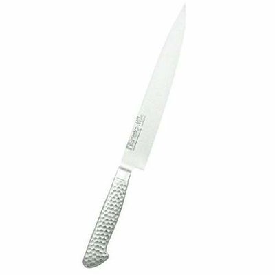 ●ハンドル部:18-8ステンレススチールモナカハンドル。ガラスビーズショット仕上げによる、手触りのソフト化、滑り防止。刃部とハンドル部の(溶接による)一体化で、雑菌等の付着防止など、従来の木ハンドルの衛生面での問題を克服しました。(手研本刃付)
