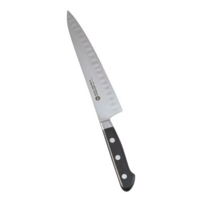 ●堺 菊守 サーモン型包丁特殊ステンレス鋼アゴの部分を斜めに丸くカットしてあり、疲れにくく、フィットします。両面に楕円状のくぼみを設けました。※包丁の表示サイズは、すべて刃渡り寸法となっております。