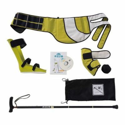 セット内容/下肢装具(内反足の底屈形状でひざ関節の不自由を疑似体験)、肘・腰サポーター(肘サポーターを装着した右腕をマジックテープで脇腹に固定し、片マヒ特有の姿勢に)、杖×1(身長145~185cm対応)、ご利用案内DVD、キャリングケース