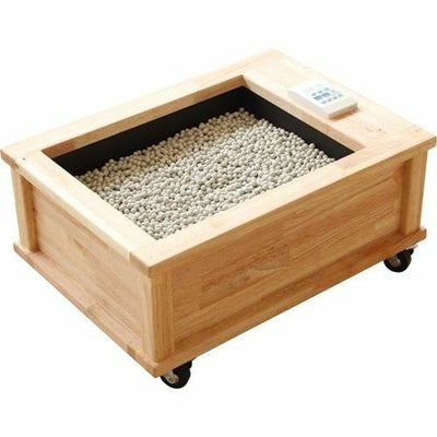 ・新感覚!!靴下のまま入れる足温器♪・セラミックボールが遠赤外線を放射し体を温めます。毎日のメンテナンスの必要なし。・遠赤外線放射率の高いセラミックボールを使って 足を温める温熱健康器具・指圧代用機です。お湯を使った足湯と違い、面倒なお湯張りや、靴下を脱ぐ必要もありません。15分程度温めれば、岩盤浴のように体中が温まり、出た後も2~3時間ポカポカとした気持ち良さが続きます。・遠赤外線セラミックボールの一粒一粒から遠赤外線を放射し、全身をやさしく温めてくれます。重みもあるため足ツボを刺激しマッサージのような気持ち良さも感じられます。・一台一台、丁寧に作っています。肌ざわり感も良く、見た目の暖かさなどインテリア性にも優れています。・10人用等オーダー可能です。 サイズ/幅61×奥行44.2×高さ28.7cm 重さ/約40kg 材質/本体:木材・セラミックスタイル・ヒーター、石:セラミックボール 電源/AC100V 消費電力/48W 付属品/リモコン、キャスター 生産国/日本