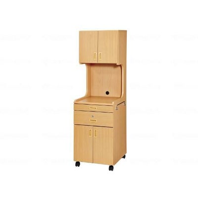 やすらぎのデザインと多機能な仕様の床頭台 ○標準装備:食事用のスライド天板・鍵付引出し・ストッパー付きキャスター(2個)・タオル掛け・下段開き戸に3段階可能棚板1枚付。