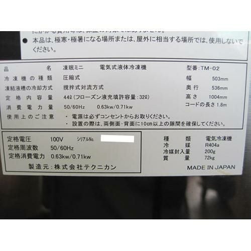 他の画像を見る 直接引取の場合は送料追加なし【新宿店】 【業界最長1年保証】【中古】液体冷凍機 アルコール付き テクニカン TM-02 幅500×奥行480×高さ850 【送料別途見積】【業務用】【新宿店在庫】 販売価格 ¥ 825,000 税込
