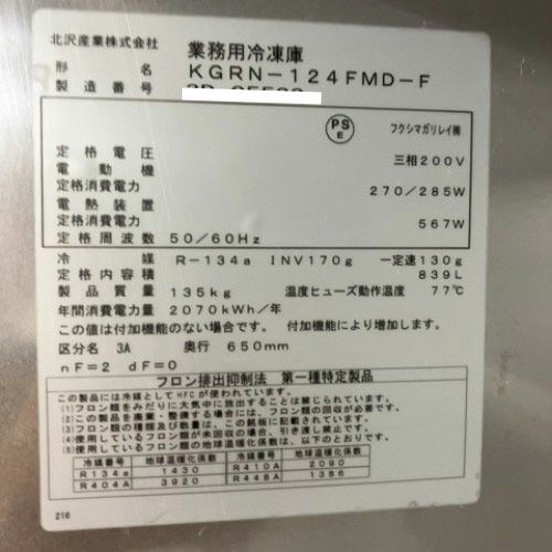 他の画像を見る 直接引取の場合は送料追加なし【水戸店】 【業界最長1年保証】【中古】縦型冷凍庫 キャスター付き 北沢産業 KGRN-124FMD-F 幅1200×奥行650×高さ1950 三相200V 【送料別途見積】【業務用】【水戸店在庫】 販売価格 ¥ 249,900 税込 詳細を見る