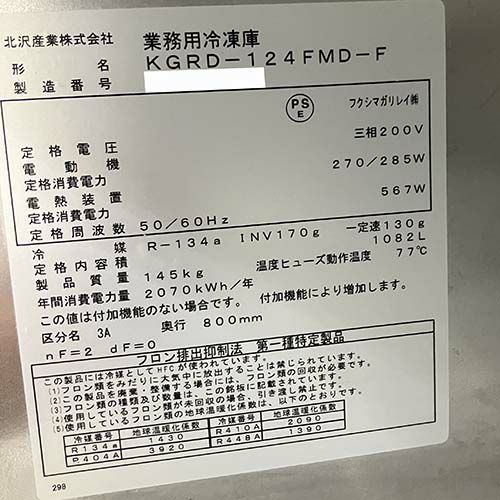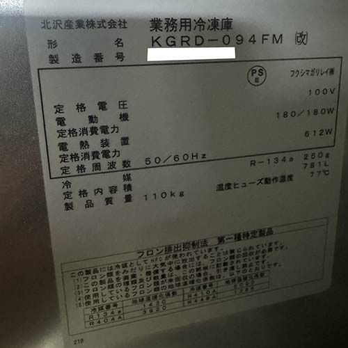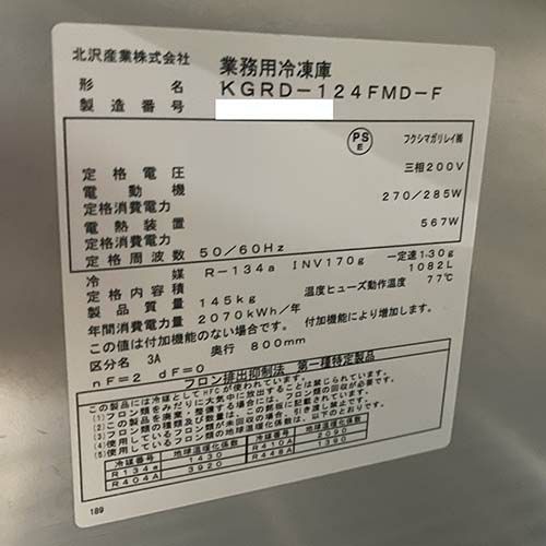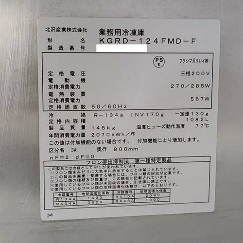 他の画像を見る 直接引取の場合は送料追加なし【札幌西野店】 【業界最長1年保証】【中古】縦型冷凍庫 北沢産業 KGRD-124FMD-F 幅1200×奥行800×高さ1950 三相200V 【送料別途見積】【業務用】【札幌西野店在庫】 販売価格 ¥ 237,160 税込 詳細を見る