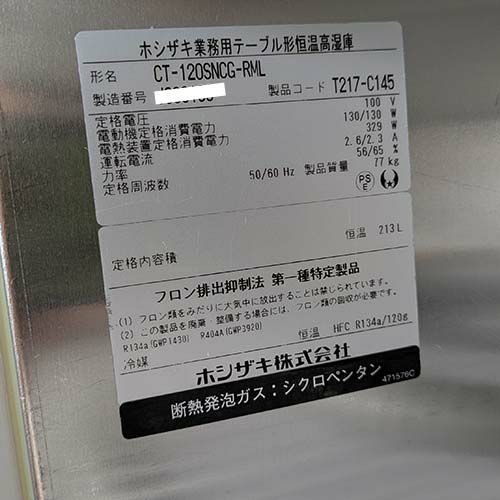 他の画像を見る 委託先様からの配送です。 【中古】恒温高湿コールドテーブル ホシザキ CT-120SNCG-ML 幅1200×奥行600×高さ800 【送料別途見積】【業務用】【委託販売-kkn】 定価 ¥ 1,128,600 (税込)のところ 販売価格 ¥ 126,500 税込