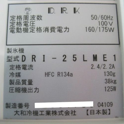 他の画像を見る 委託先様からの配送です。 【中古】製氷機 25kg 大和冷機 DRI-25LMF 幅395×奥行450×高さ770 【送料別途見積】【業務用】【委託販売-yck】 販売価格 ¥ 143,749 税込
