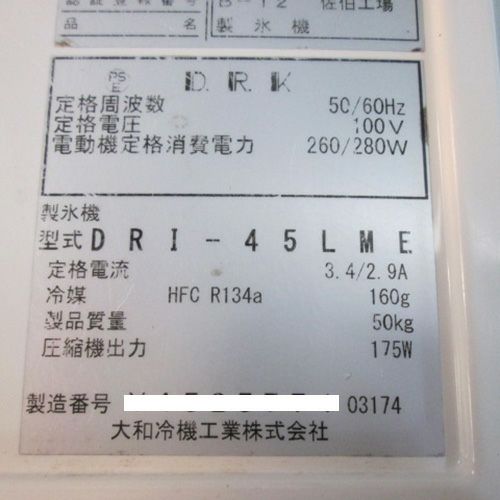 他の画像を見る 委託先様からの配送です。 【中古】製氷機 大和冷機 DRI-45LME 幅630×奥行450×高さ800 【送料別途見積】【業務用】【委託販売-rks】 定価 ¥ 672,000 (税込)のところ 販売価格 ¥ 209,000 税込