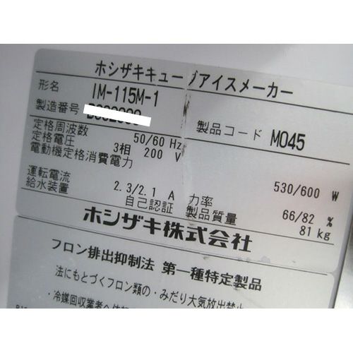 他の画像を見る 委託先様からの配送です。 【中古】製氷機 115kg ホシザキ IM-115M-1 幅700×奥行525×高さ1200 【送料別途見積】【業務用】【委託販売-yck】 販売価格 ¥ 356,500 税込