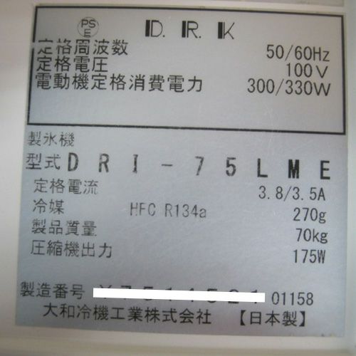 他の画像を見る 委託先様からの配送です。 【中古】製氷機 75kg 大和冷機 DRI-75LME 幅700×奥行506×高さ1200 【送料別途見積】【業務用】【委託販売-yck】 販売価格 ¥ 218,500 税込