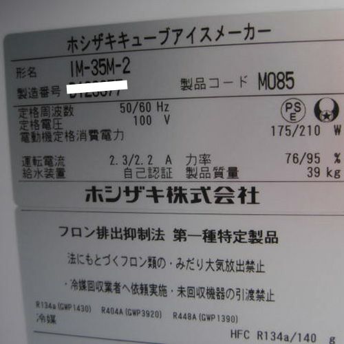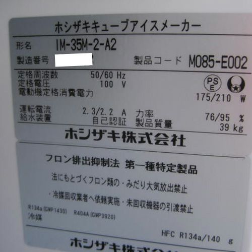 他の画像を見る 委託先様からの配送です。 【中古】製氷機 35kg ヒューズ仕様 ホシザキ IM-35M-2-A2 幅500×奥行450×高さ800 【送料別途見積】【業務用】【委託販売-yck】 販売価格 ¥ 239,201 税込
