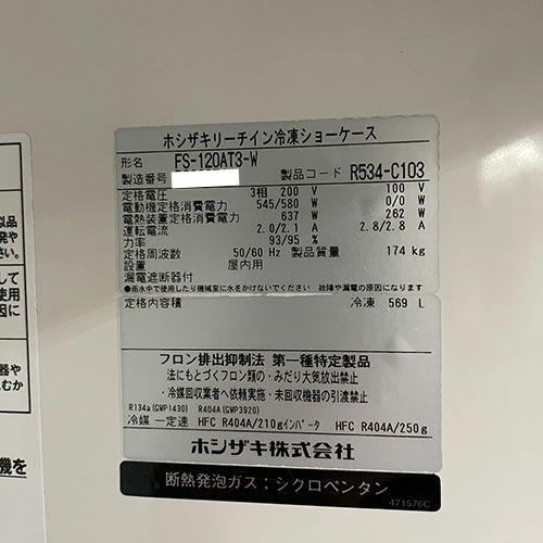 他の画像を見る 直接引取の場合は送料追加なし【札幌西野店】 【業界最長1年保証】【中古】冷凍リーチインショーケース スイング扉 ホシザキ FS-120AT3-W 幅1200×奥行650×高さ1970 三相200V/単相100V 【送料別途見積】【業務用】【札幌西野店在庫】 販売価格 ¥ 429,000 税込
