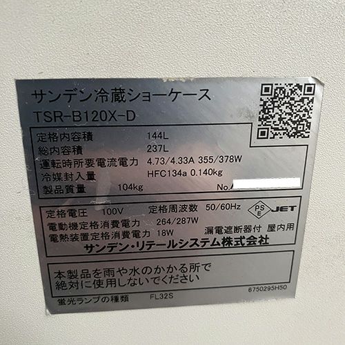 他の画像を見る 直接引取の場合は送料追加なし【製菓製パン堺センター】 【業界最長1年保証】【中古】対面冷蔵ショーケース サンデン・リテールシステム TSR-B120X-D 幅1200×奥行493×高さ1000 【送料別途見積】【業務用】【製菓製パン堺センター在庫】 販売価格 ¥ 462,000 税込