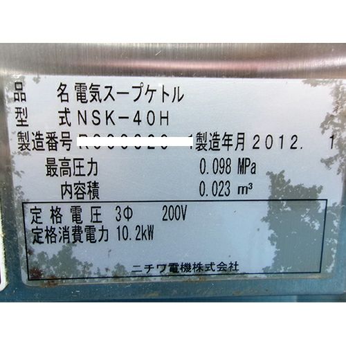 他の画像を見る 委託先様からの配送です。 【中古】電気スープケトル ニチワ電機 NSK-40H 幅1035×奥行770×高さ870 三相200V 【送料別途見積】【業務用】【委託販売-kkn】 定価 ¥ 2,186,800 (税込)のところ 販売価格 ¥ 429,000 税込