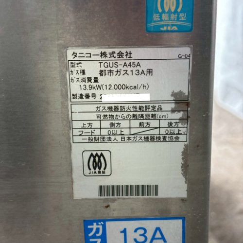 他の画像を見る 直接引取の場合は送料追加なし【新潟店】 【業界最長1年保証】【中古】ガスゆで麺器 角槽タイプ タニコー TGKU-45 幅450×奥行600×高さ850 都市ガス 【送料別途見積】【業務用】【新潟店在庫】 販売価格 ¥ 204,490 税込