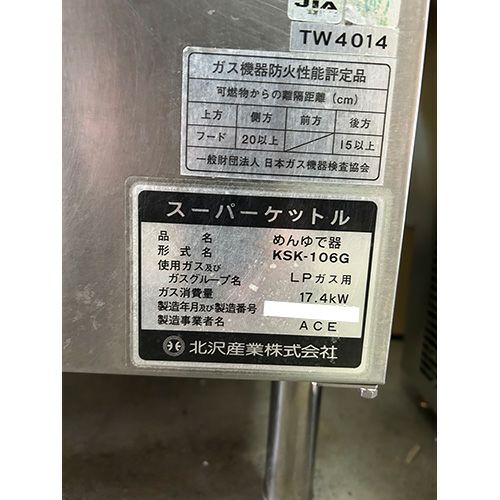 他の画像を見る 直接引取の場合は送料追加なし【旭川センター】 【業界最長1年保証】【中古】ゆで麺器 6テボ 北沢産業 KSK-106G 幅450×奥行650×高さ800 LPG(プロパンガス) 【送料別途見積】【業務用】【旭川センター在庫】 販売価格 ¥ 165,000 税込