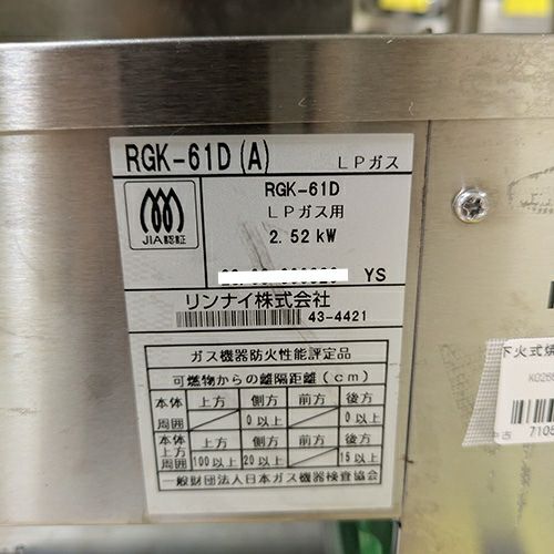 他の画像を見る 直接引取の場合は送料追加なし【宮崎店】 【中古】下火式焼物器 リンナイ(Rinnai) RGK-61D 幅606×奥行209×高さ216 LPG(プロパンガス) 【送料別途見積】【業務用】【宮崎店在庫】 販売価格 ¥ 28,380 税込